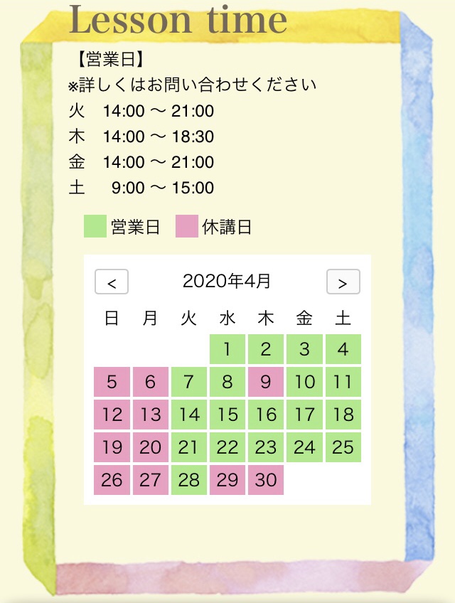 ※今後、政府・行政等により外出自粛等の発令が下された際は、レッスン日を再度調整させていただくことがございます。予めご了承ください。